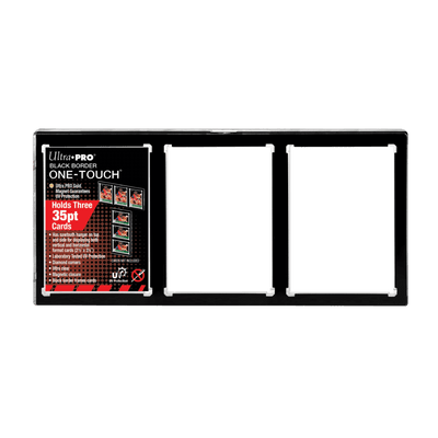 The 3-Card Black Border ONE-TOUCH display features a black border to perfectly frame your cards. Designed as the final destination for your collectible cards, our two-piece ONE-TOUCH holders are uniquely designed with slide-in hinge and magnetic closure so you’ll never have to use a screwdriver again. The holder provides UV-resistant, no-PVC and acid free protection to ensure your valuable hit retains its condition while under display. Our ONE-TOUCH holders are ideal for presenting prized and super rare gaming cards as well. Has sawtooth hangers on the top and on the side of the display to allow displaying both vertical and horizontal format cards. This model can hold three standard cards (2-1/2″ X 3-1/2″) up to 35pt in thickness.