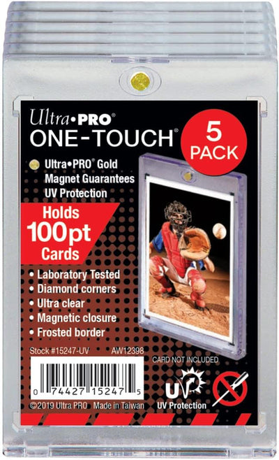 Ultra PRO's ONE-TOUCH holders are premium trading card storage cases designed as the final destination for your collectible trading cards. The two-piece ONE-TOUCH holders are uniquely designed with slide-in hinges and magnetic closure so you'll never have to use a screwdriver again. The holder uses UV-blocking additives to protect your card from harmful UV rays and is made with non-PVC materials to provide acid-free protection - ensuring your valuable hit retains its condition while under the display. Our ONE-TOUCH holders are ideal for presenting prized and super rare gaming cards as well. This model can hold standard cards (2.5" x 3.5") with multiple thickness options.